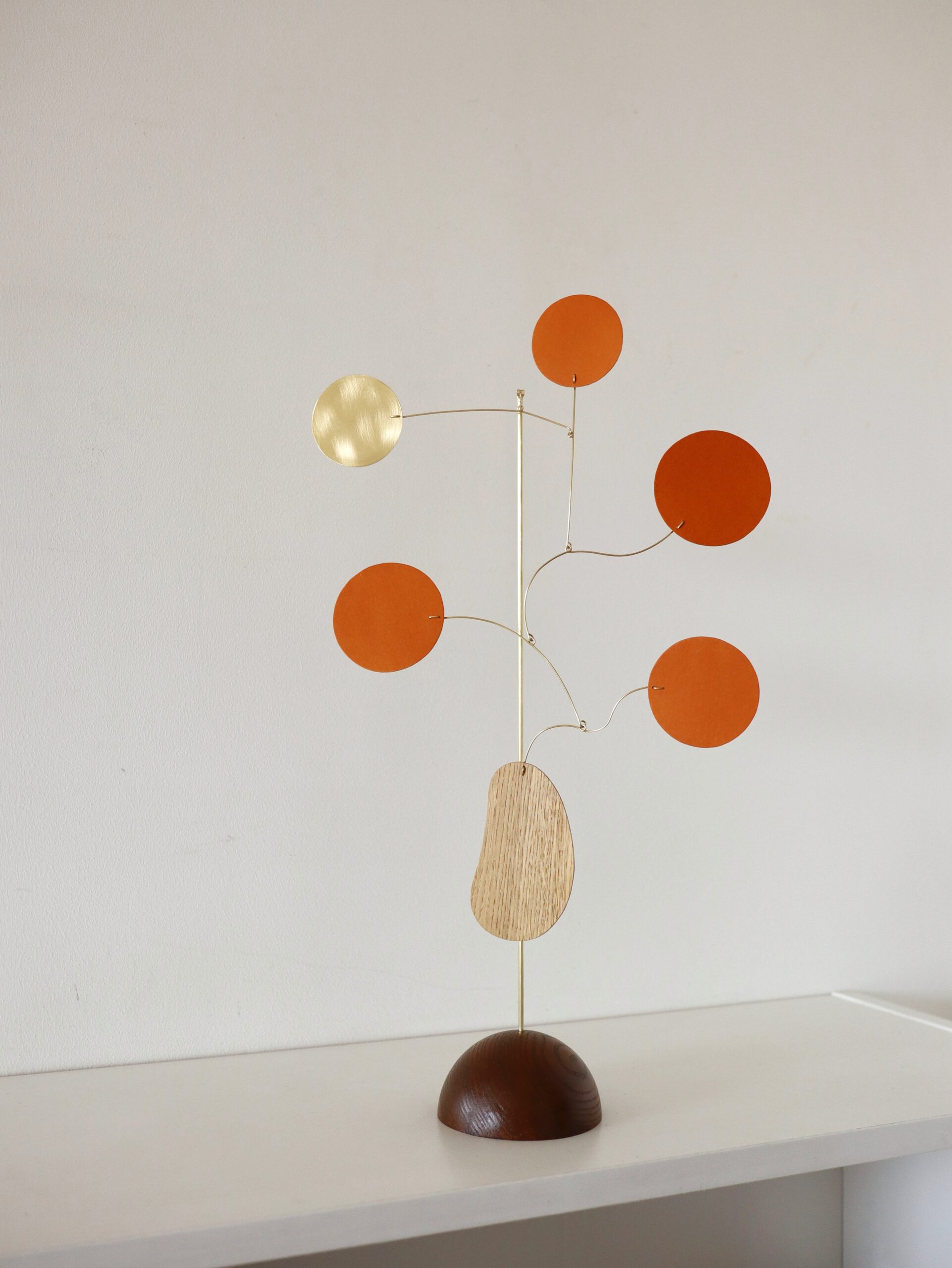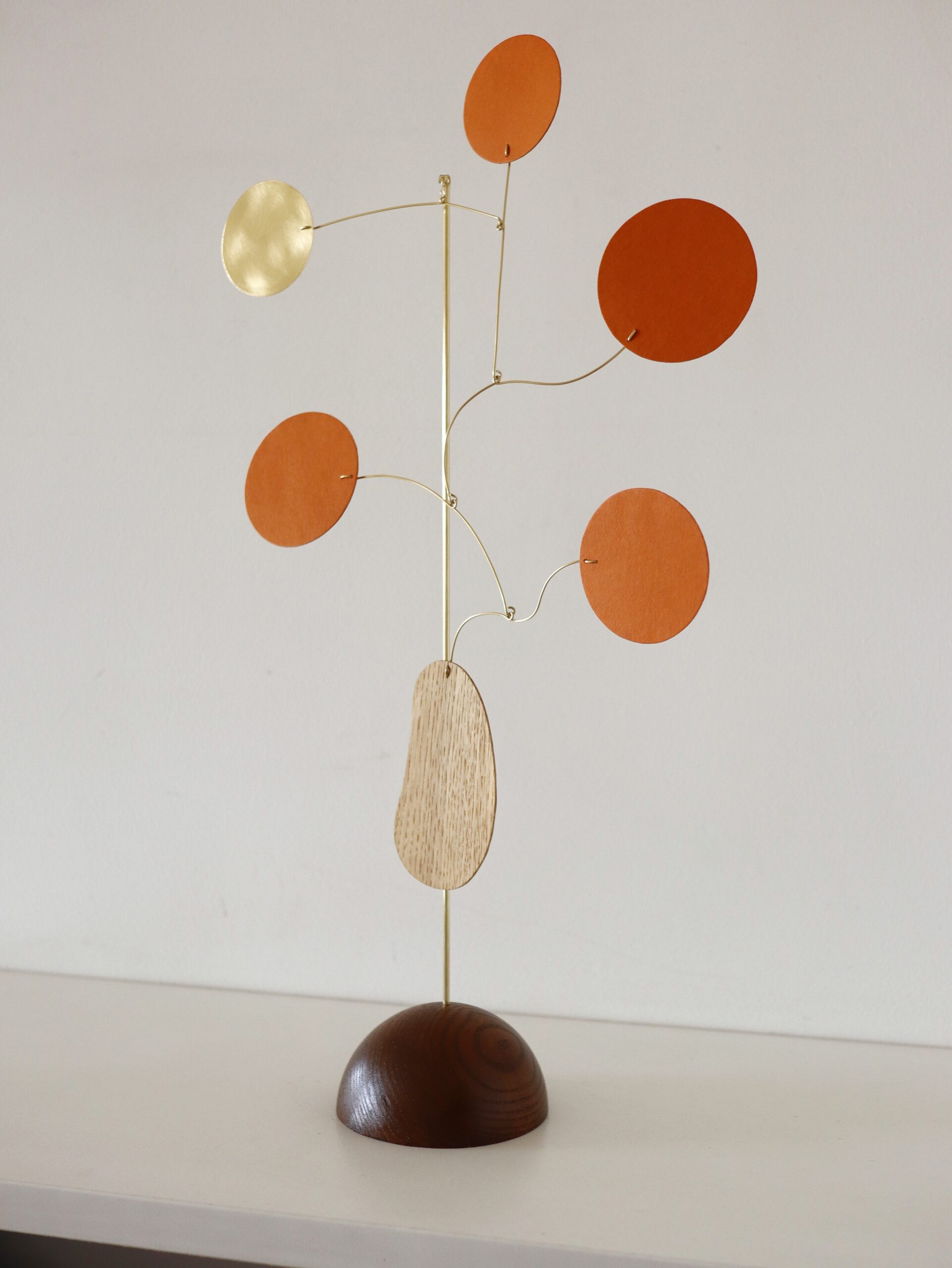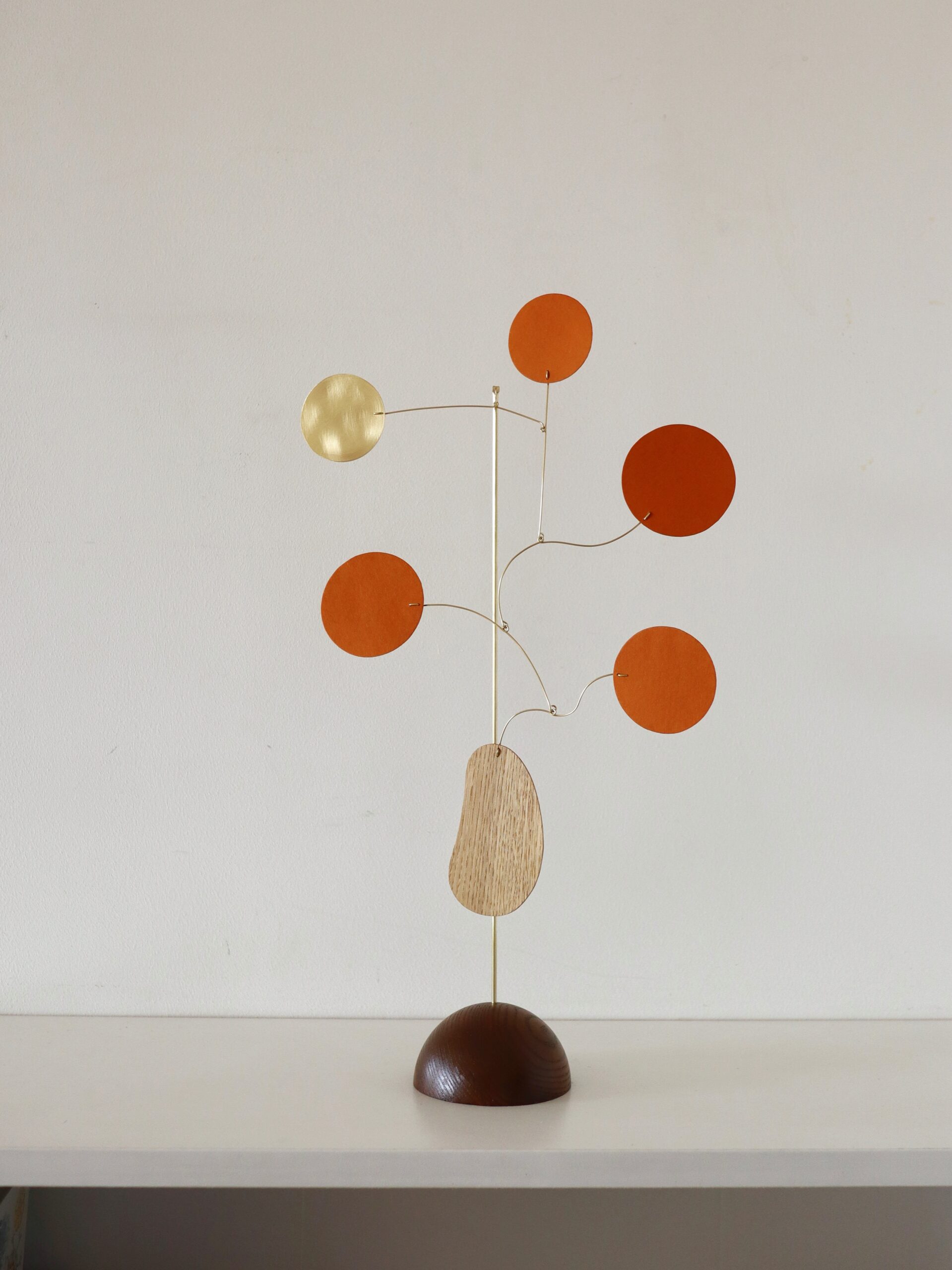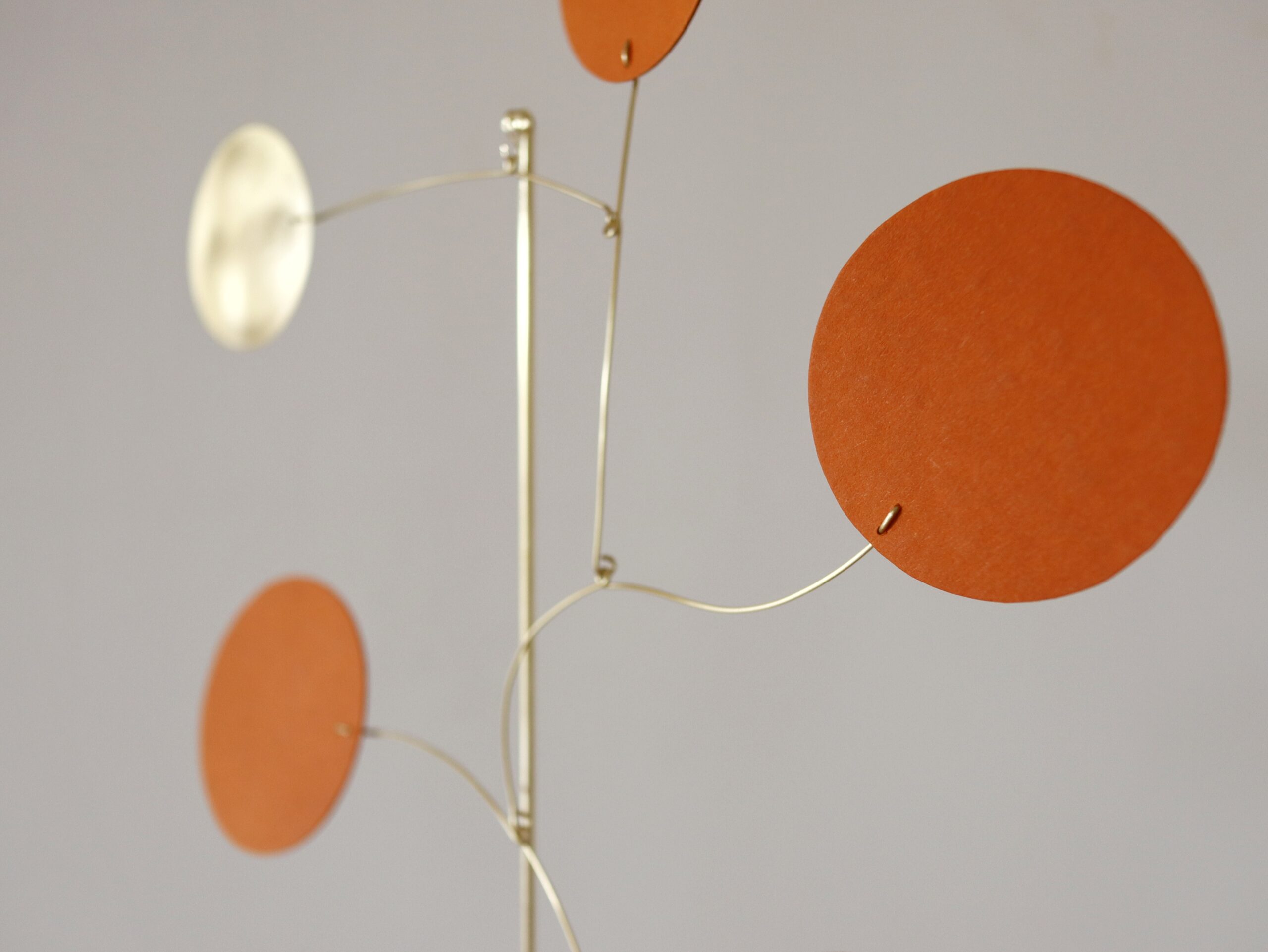 Beautiful desktop kinetic mobile made of wood, brass, and handcrafted extra-thick paper. Its simple construction is inspired by Mid-Century Modern design and the Bauhaus decorative style.