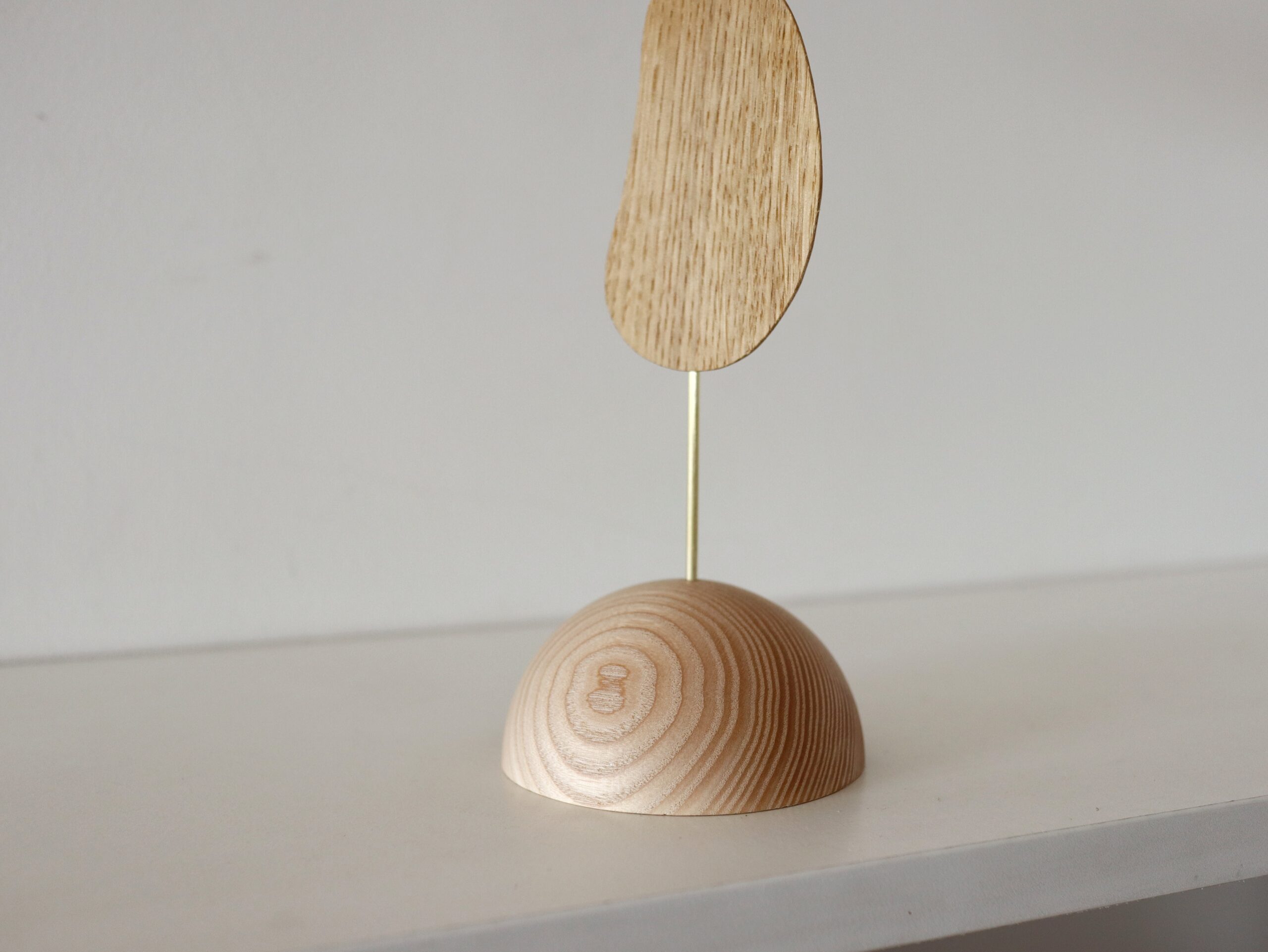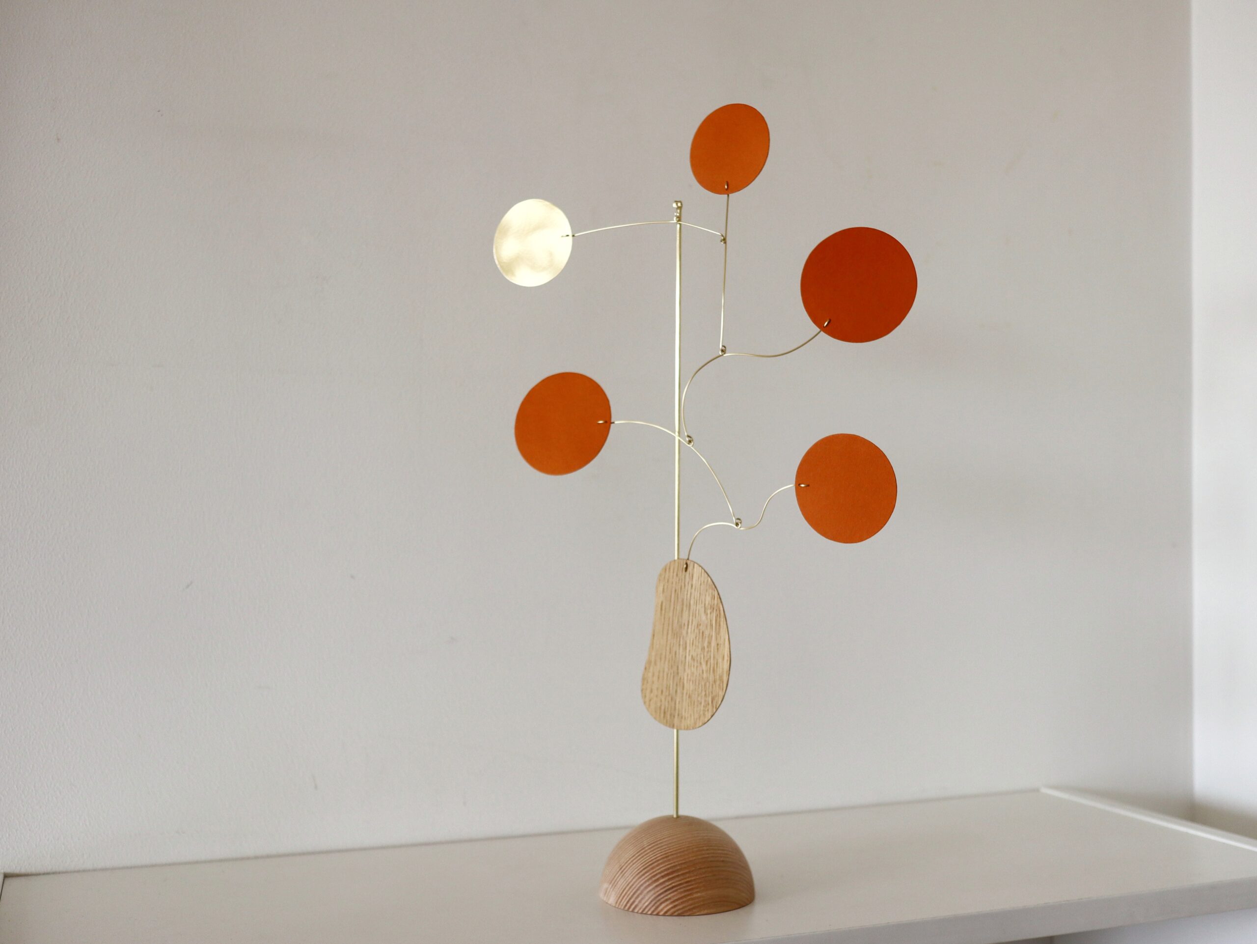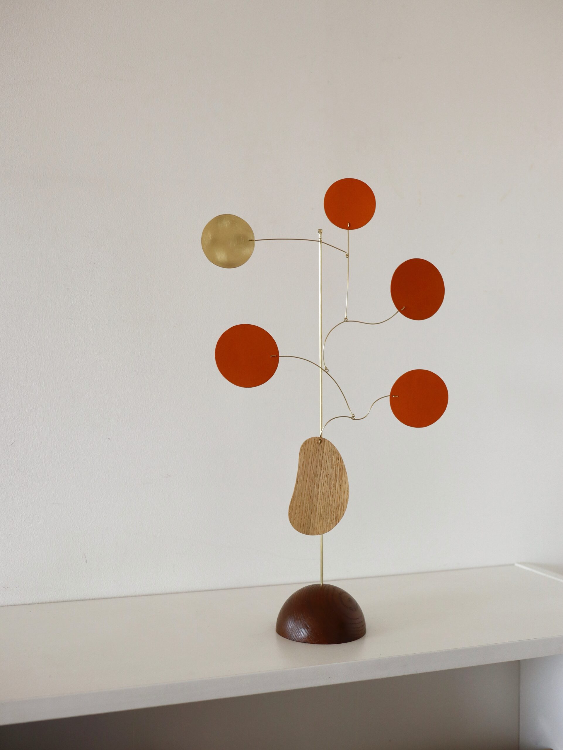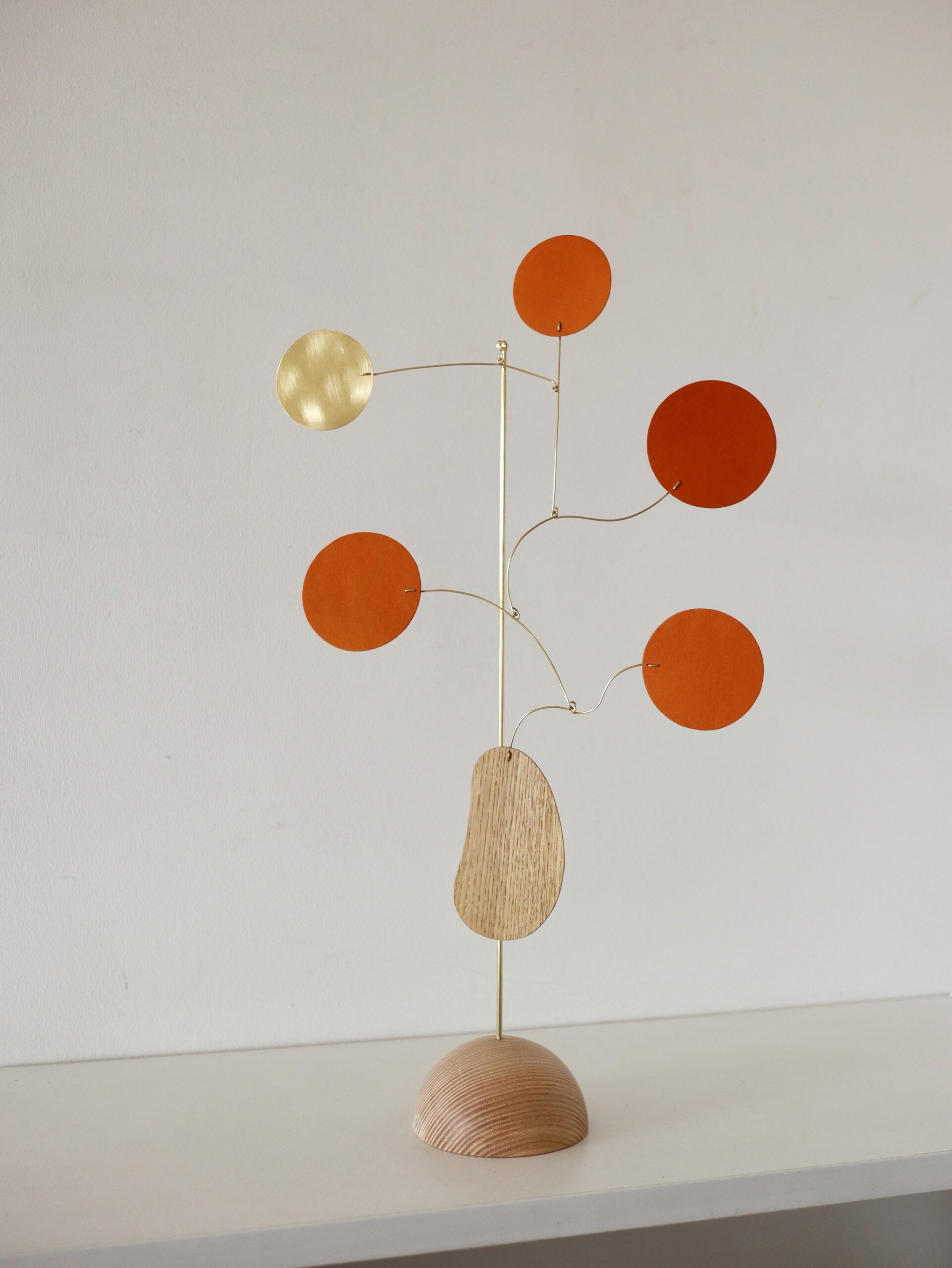Beautiful desktop kinetic mobile made of wood, brass, and handcrafted extra-thick paper. Its simple construction is inspired by Mid-Century Modern design and the Bauhaus decorative style.