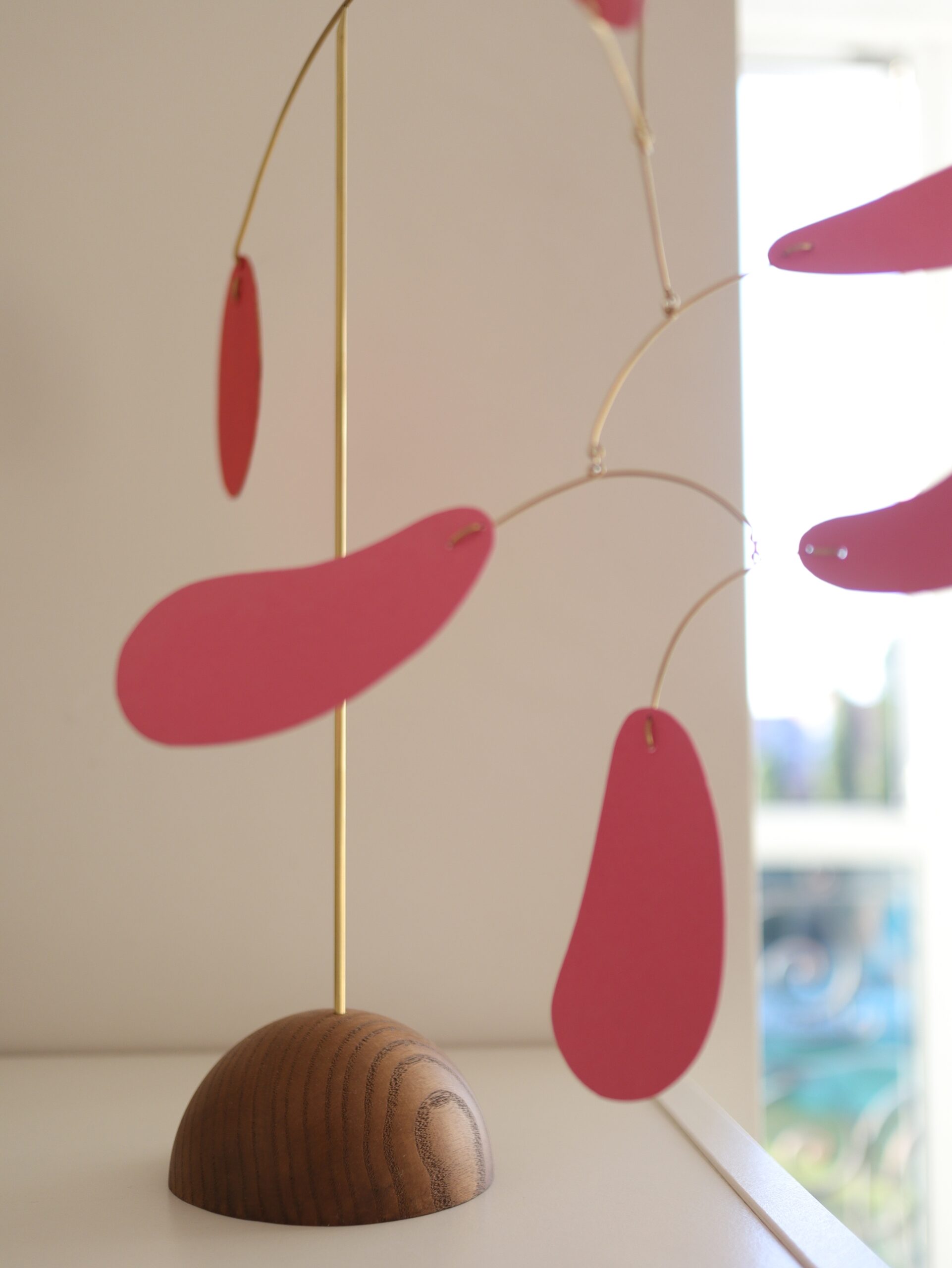 Tabletop kinetic mobile handcrafted by unique design and made of wood and brass. Its simple construction was inspired by Mid-Century Modern design.