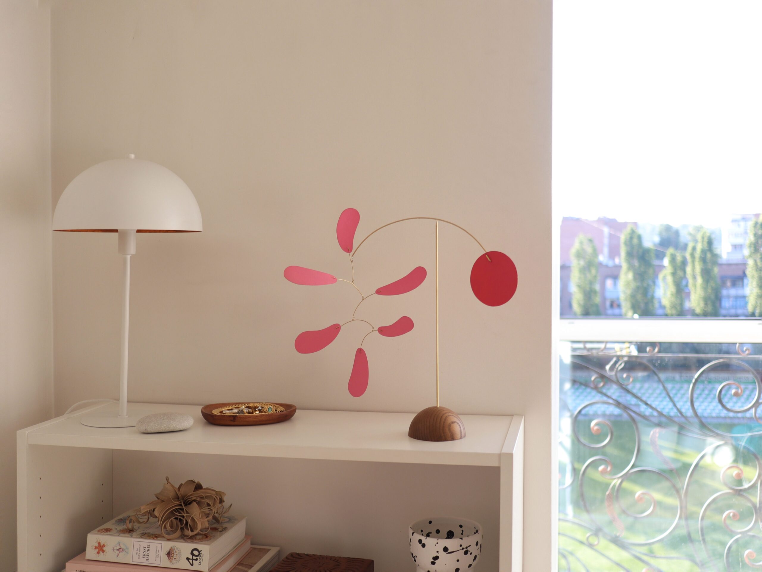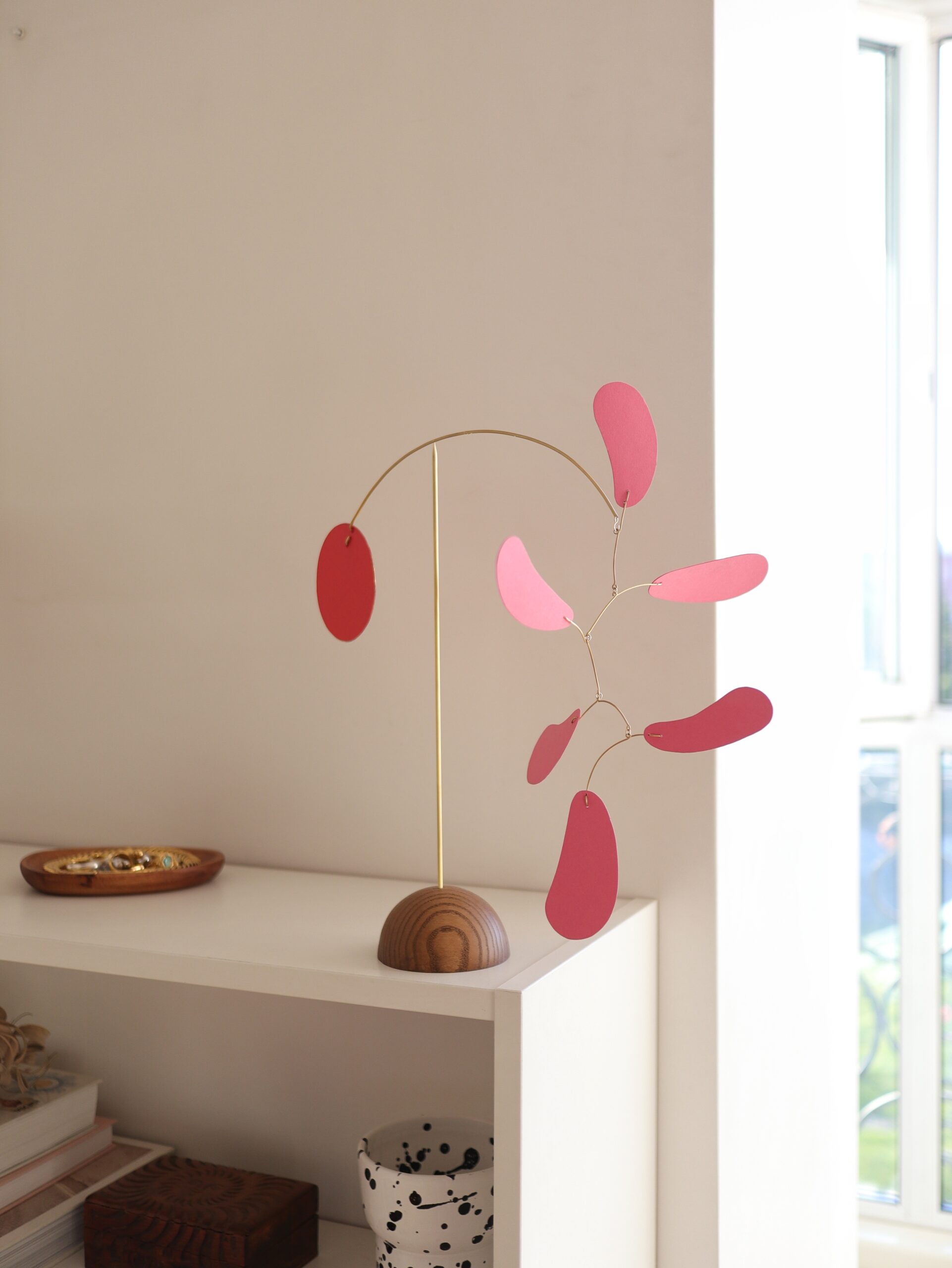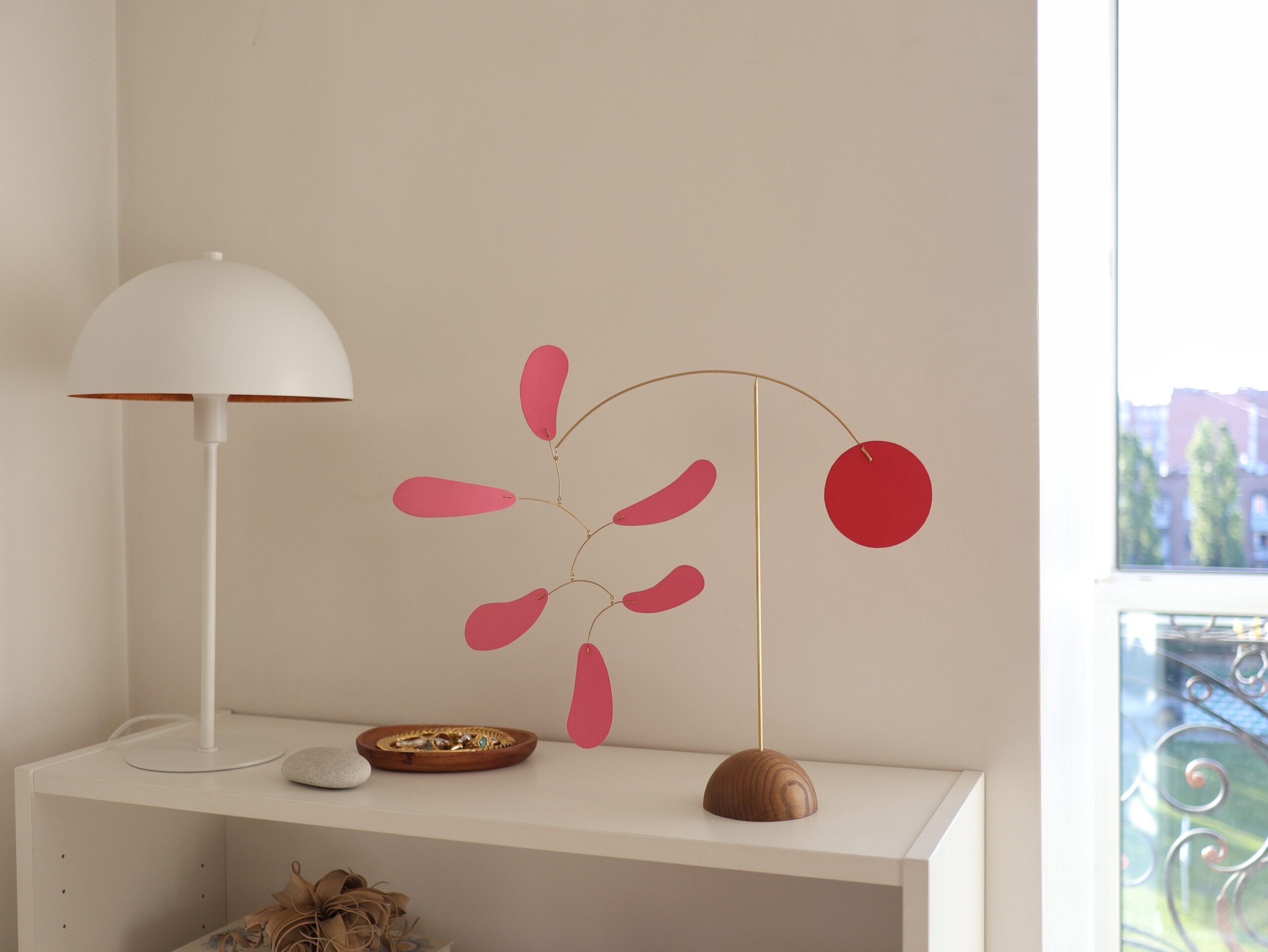 Mobile can be placed on the coffee table, desktop, shelf, dresser or other flat surfaces. Perfectly balanced this sculpture gets in motion by a slight movement of air. And gently inclines up and down, turning a full 360 degrees around its axis with effortless grace.
